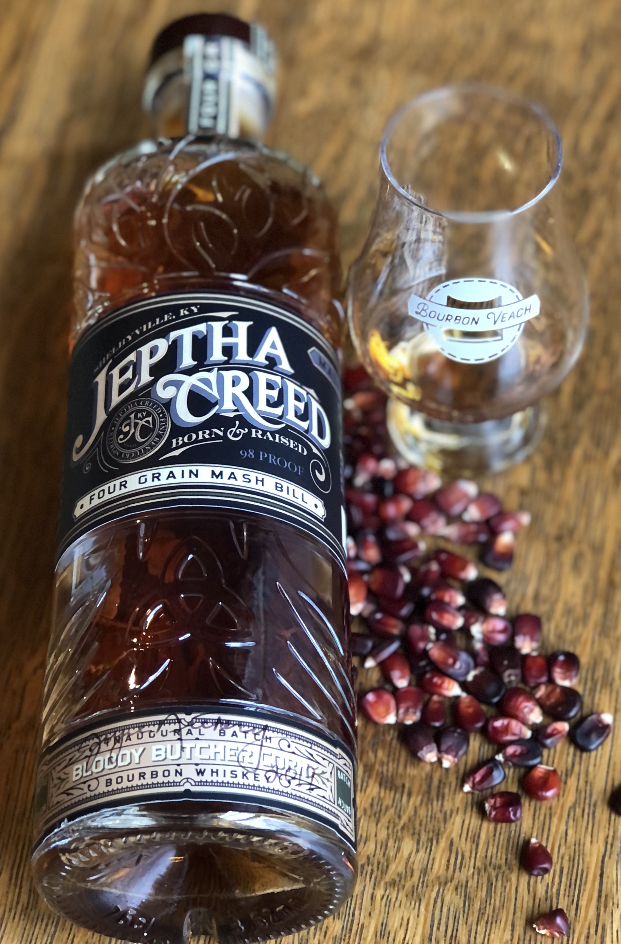 Jeptha Creed Distillery is owned by the Nethery family of Shelby County, Kentucky. They are true farmer-distillers. They plant the Bloody Butcher corn on their farm and Joyce Nethery, the distiller, turns it into Bourbon. Joyce is fond of telling the story that one of the reasons she uses Bloody Butcher is the fact that the white tailed deer will pass up fields of yellow corn to eat her Bloody Butcher corn. If the deer like it so much, it is a sign that it tastes better than yellow corn. They have a straight four grain Bourbon on the market that is between two and three years old, and soon should have a traditional Bourbon and a wheated Bourbon on the market. They are waiting until those whiskeys are at least four year old before releasing them to the public. These whiskeys all use the Bloody Butcher corn. The four grain is 98 proof and has a nose that is corn, vanilla, peaches, baking spice and sweet oak. The taste is corn, peaches, allspice, vanilla and oak. The finish is long with some sweet oak, vanilla and cinnamon. There is a rich, chewy mouth-feel to this whiskey that is probably from the corn. The corn sweetness of the taste is very rich and sweeter than most Bourbons. Bloody Butcher definitely makes a very different flavor profile.
